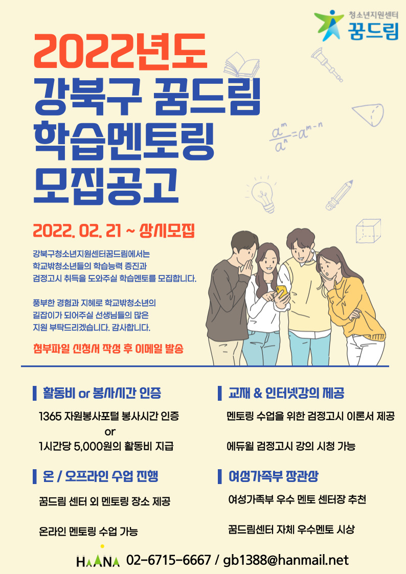 2022년도 1388청소년지원단 강북구 꿈드림 학습멘토단 모집 안내
