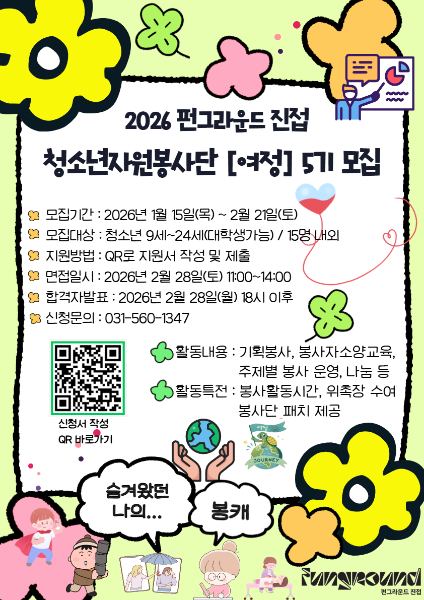 | 제목 | [펀그라운드 진접] 청소년 자원봉사단 5기 참가자 모집 | 날짜 | 2026-01-27 | 조회수 | 66 |