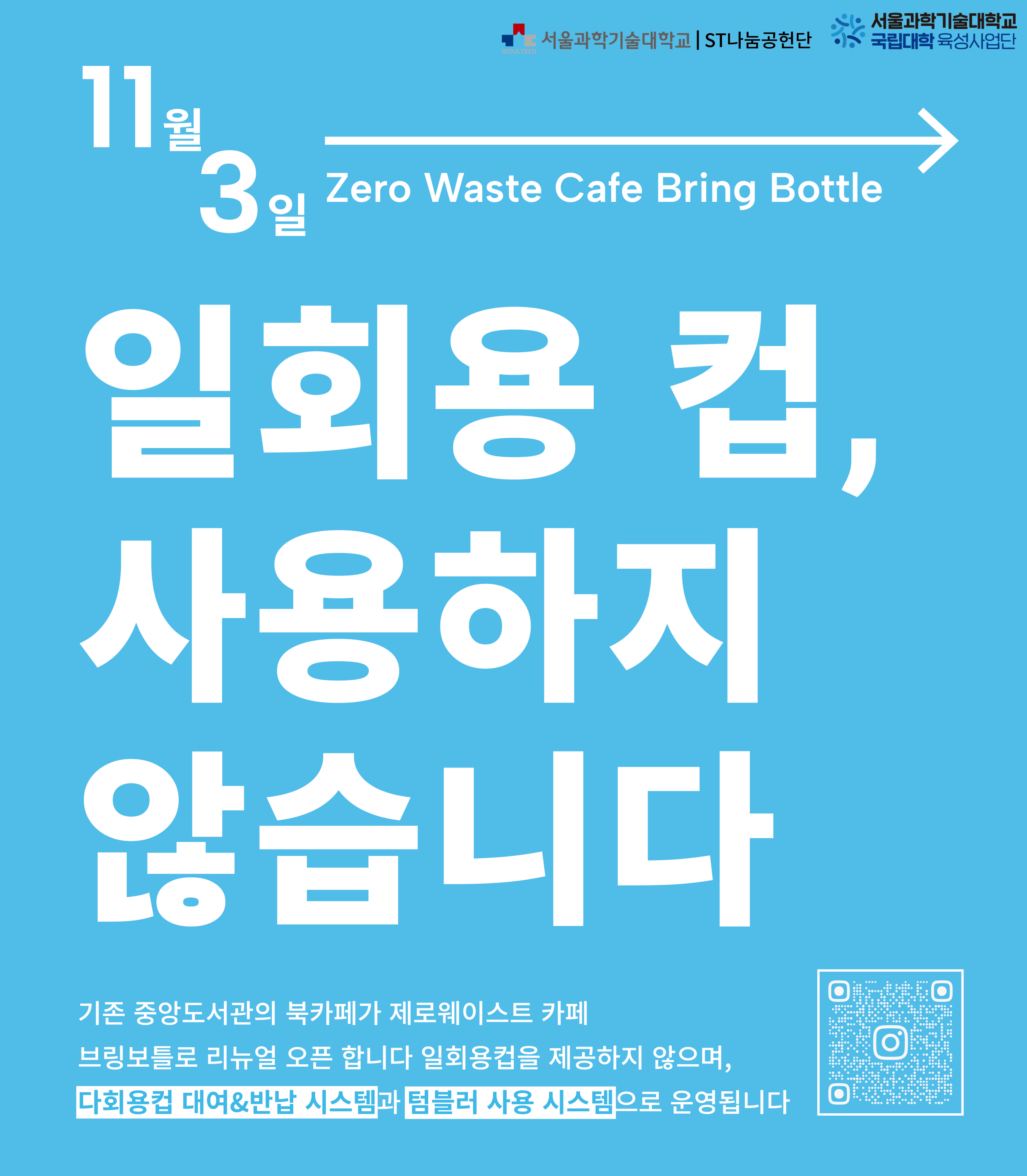 2025년 11월부터 중앙도서관의 북카페에서는 모든 음료를 일회용 컵이 아닌, 다회용기에 담아서 드립니다. 개인 텀블러를 들고 오시는 것을 적극 추천합니다❣️