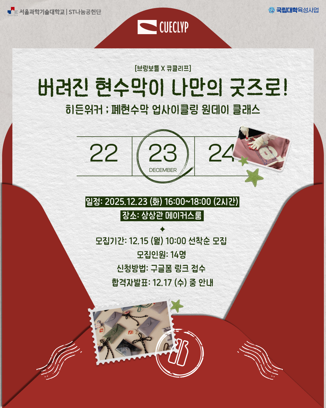 | 제목 | 브링보틀 서포터즈×큐클리프 업사이클링 원데이 클래스💌(국립대학육성사업) | 날짜 | 2025-12-12 | 조회수 | 86 |